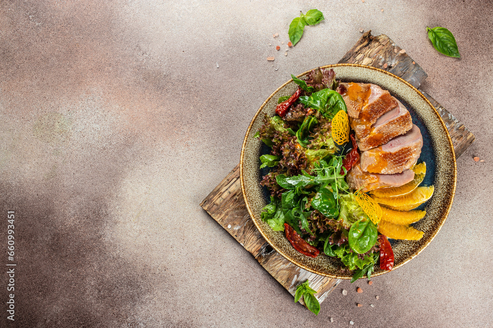 Roast duck breast with orange and greens. Restaurant menu, dieting, cookbook recipe top view