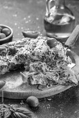 greek spanakopita pie with organic cheese on a wooden board, Restaurant menu, dieting, cookbook recipe top view