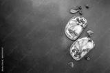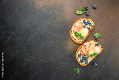Delicious toast with cream cheese, honey, peaches and blueberries. Concept healthy and balanced eating. place for text, top view
