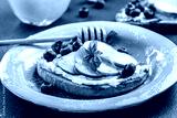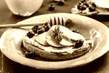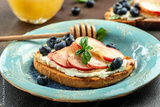 Sweet toast with ricotta cheese, honey and peach on a wooden board, Food recipe background. Close up