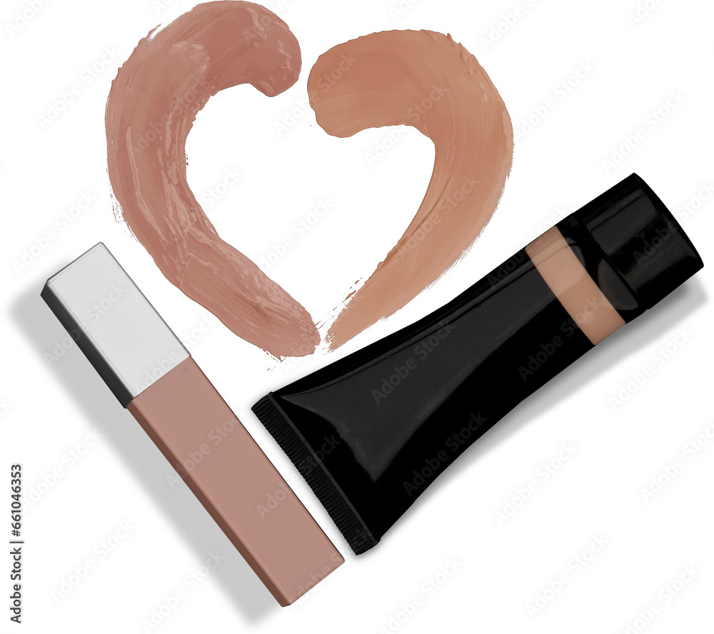 Strokes of foundation in the shape of a heart. Black cream tube mockup. Product mock up, blank packaging for cosmetic products.