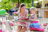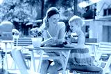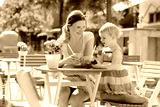 Mother and little daughter relaxing with drinks in outdoors cafe