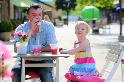 Father and little daughter relaxing with drinks in outdoors cafe
