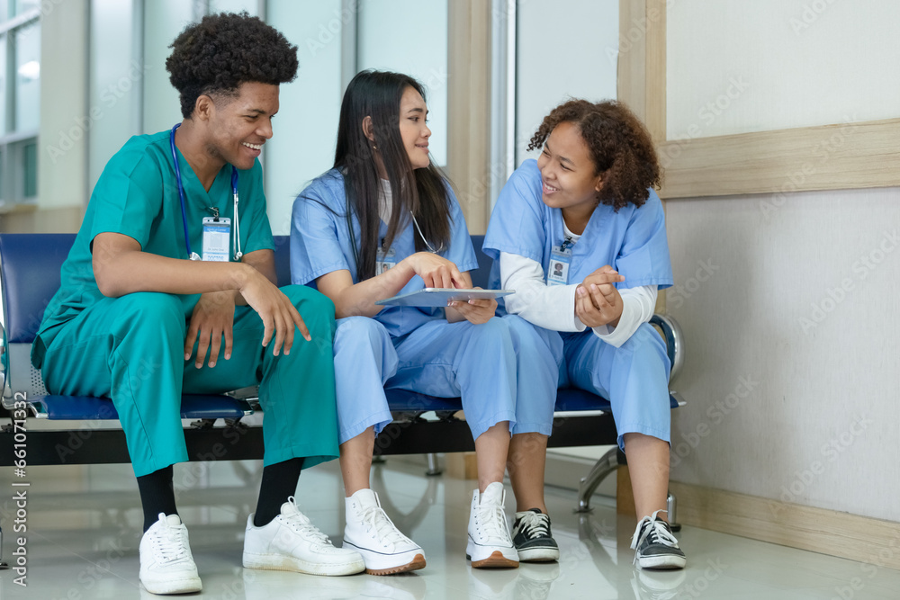 Group of medical student sitting front classroom using tablet searching information study and talking in hospital university. education and learning medical concept.