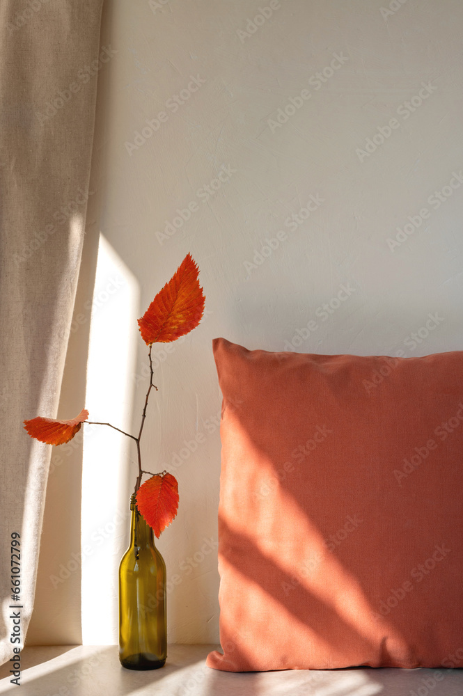 Cozy warm autumn home interior decoration. Vase with tree branch with red fall leaves, orange pillow on floor, beige linen curtain and empty neutral concrete wall background with sunlight shadows