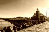 Old brick lighthouse at the Wieprza river mouth to the Baltic Sea in Darlowko, Poland