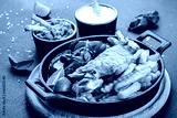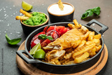 Authentic traditional British cuisine fish and chips served with mashed peas, vegetable salad, tartar sauce. top view
