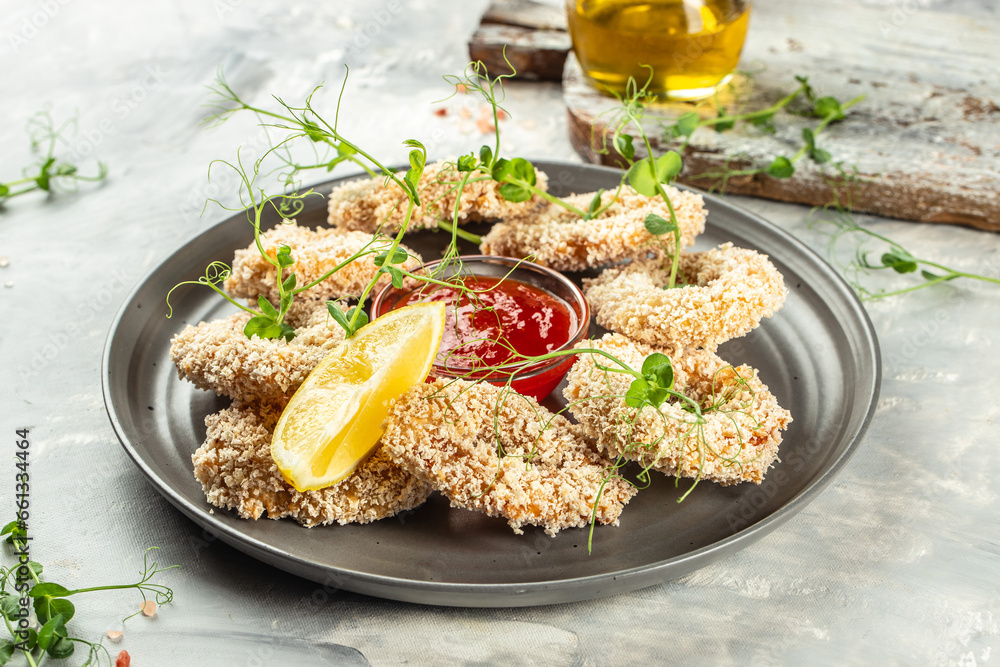 Fried squid rings Calamari breaded on a light background top view. place for text
