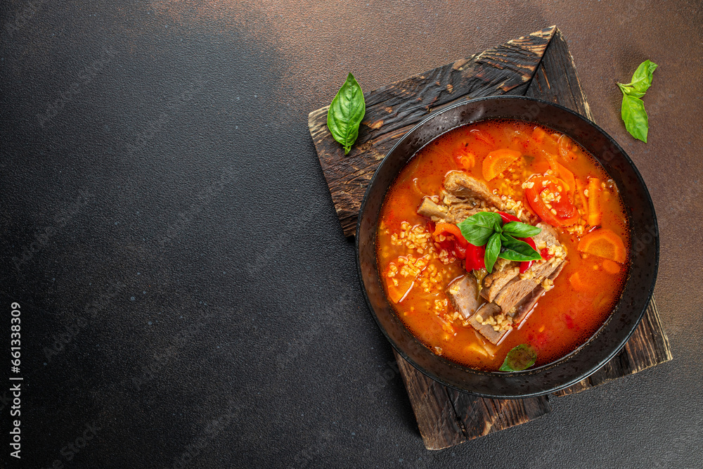 Soup of bulgur and tomatoes with smoked ribs on a dark background. top view. place for text