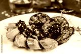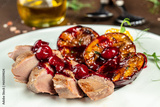 Baked duck fillet with plums. Food recipe background. Close up