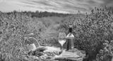 wine, fruits, berries, cheese, glasses picnic in lavender field Selective focus
