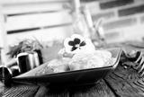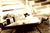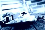 Chicken patties or fish cakes fried in breadcrumbs with ketchup