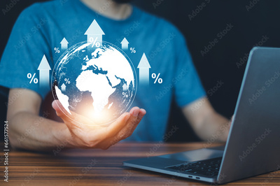 Businessman with percentage sign and arrow up, financial growth, interest rate increase, inflation, high price and tax rise concept
