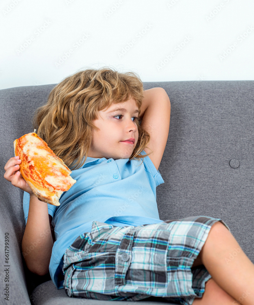 Child biting off big slice fresh made pizza. Little boy eating pizza. Cute little boy eats pizzas. Teen boy holding slice pizza. Child delicious Italian pizzas
