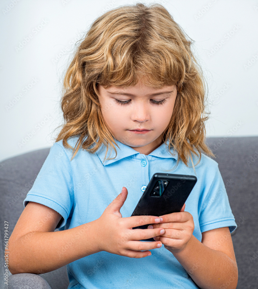 Little boy using smartphone, looking at screen, child holding phone in hands, playing mobile device game, watching cartoons online
