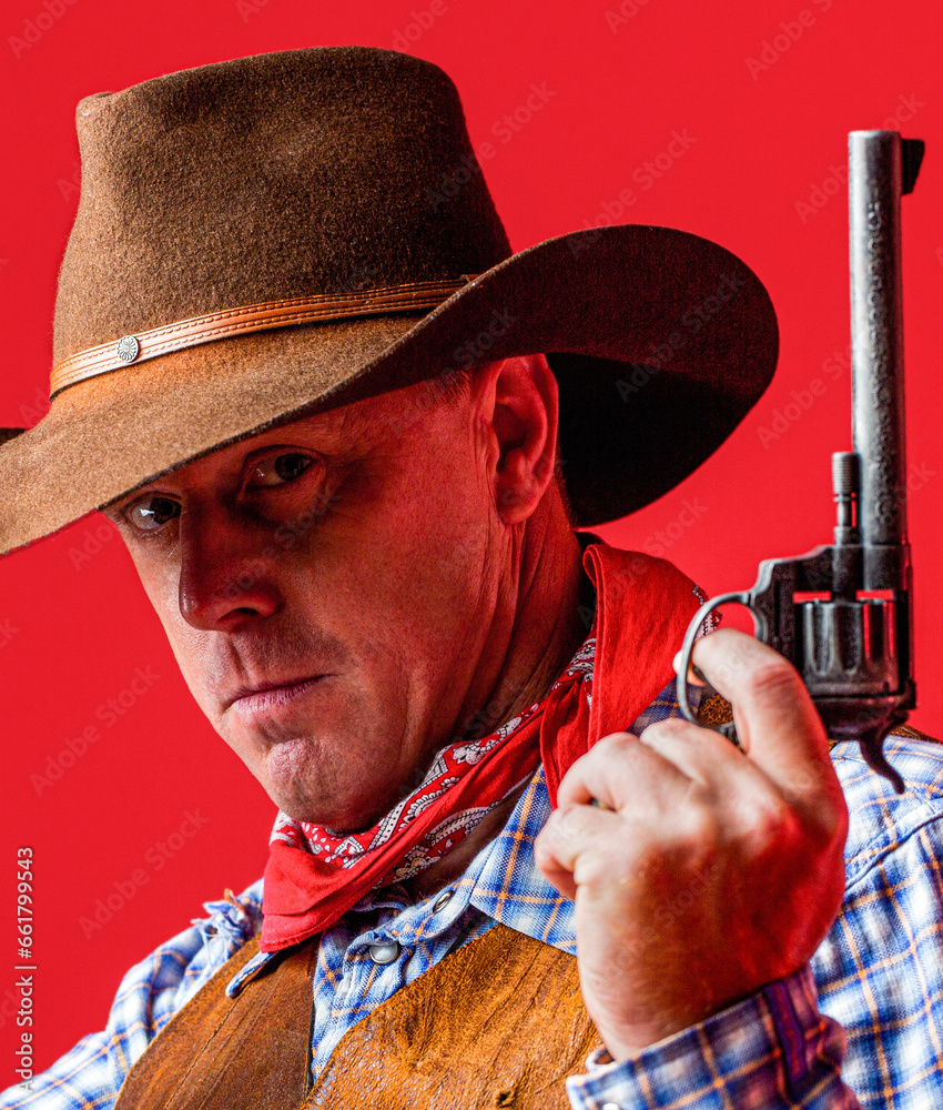 Man wearing cowboy hat, gun. West, guns. Portrait of a cowboy. American cowboy. Cowboy wearing hat. Western life. Guy in cowboy hat. American bandit in mask, western man with hat