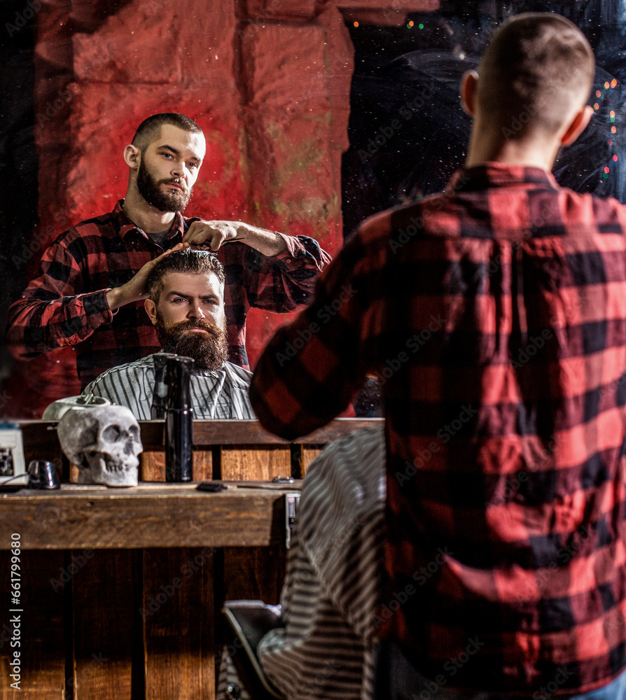 Man hairstylist. Man visiting hairstylist in barbershop. Bearded man in barbershop. Work in the barber shop. Hairstylist serving client at barber shop