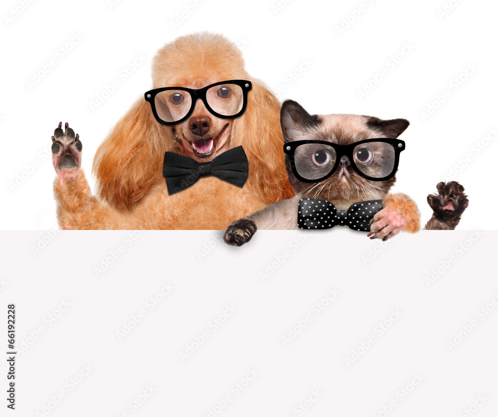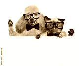 Dog with a cat holding in his paws white banner.
