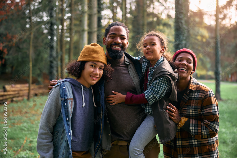 Happy black family enjoying in camping weekend in woods and looking at camera.