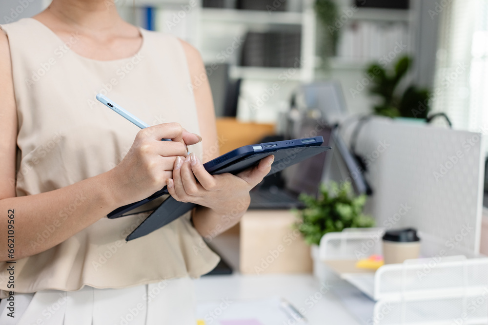 ฺbusinesswoman holding tablet standing at modern office looking at camera. business professional or support partnership. HR officers make presentations for employees in organization.
