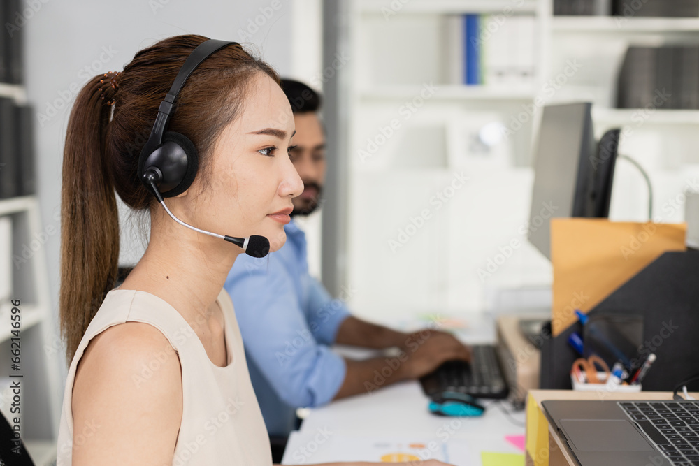 Female wear headset operator worker call center hotline. woman working customer support service operator. communication in corporate; Business advisor concept.