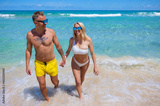 Happy couple coming out of water on hot summer day at the beach