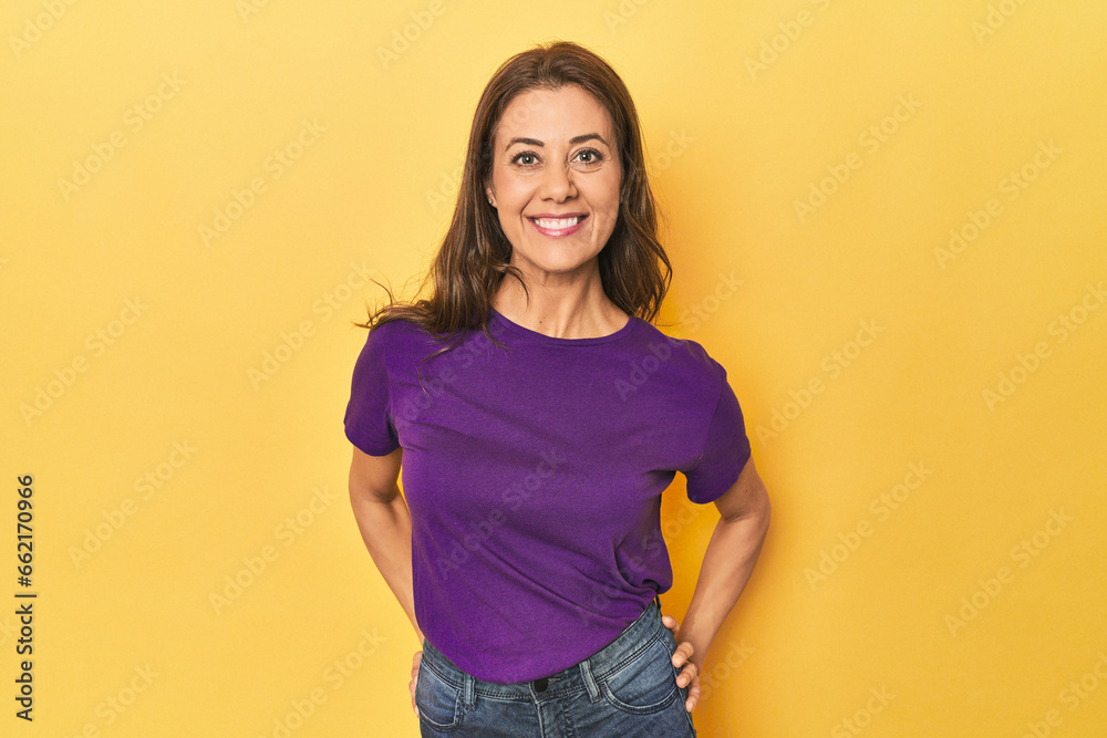 Middle-aged caucasian woman on yellow happy, smiling and cheerful.