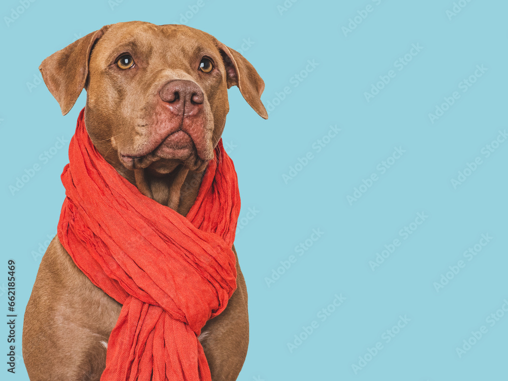 Cute brown dog and a red knitted scarf around his neck. Isolated background. Close-up, indoors. Studio photo. Day light. Beauty and fashion. Concept of care, education, training and raising pets