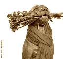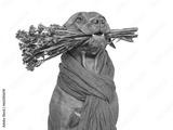 Cute brown dog and bright flowers. Closeup, indoors. Studio shot. Congratulations for family, relatives, loved ones, friends and colleagues. Pets care concept