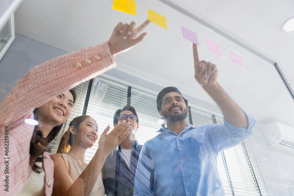 Business team meeting planning new strategy using colored sticky notes on mirror board in workplace, business teamwork brainstorm concept.