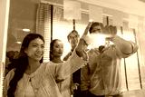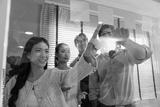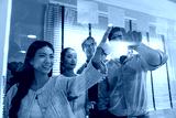Business team meeting planning new strategy using colored sticky notes on mirror board in workplace, business teamwork brainstorm concept.