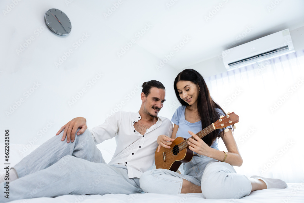 happy couple playing ukulele on bed in bedroom. man and woman enjoying playing music creates happy activities in family. young couple fun happiness romantic with instrument.