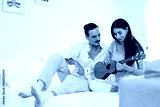 happy couple playing ukulele on bed in bedroom. man and woman enjoying playing music creates happy activities in family. young couple fun happiness romantic with instrument.