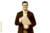 Smiling businessman looking at camera, holding closed laptop as if going to office