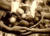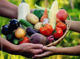 A woman and a boy are holding a basket with freshly picked organic vegetables
