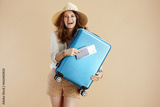 happy stylish woman in blouse and shorts on beige