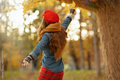 cheerful stylish female in jeans shirt and red hat rejoicing
