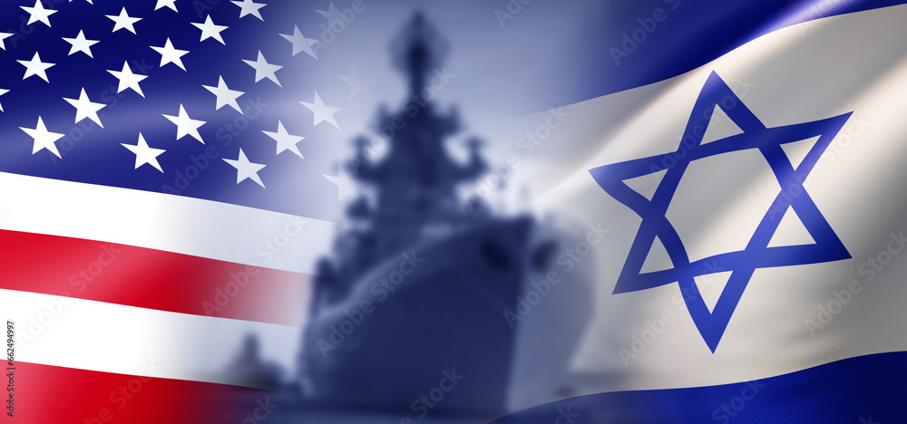 Flag of Israel. US navy. Warship near Israeli banner. Concept of arrival of aircraft carriers from US to Persian gulf. US military support for Israel. Warship from America or Israel. 3d image