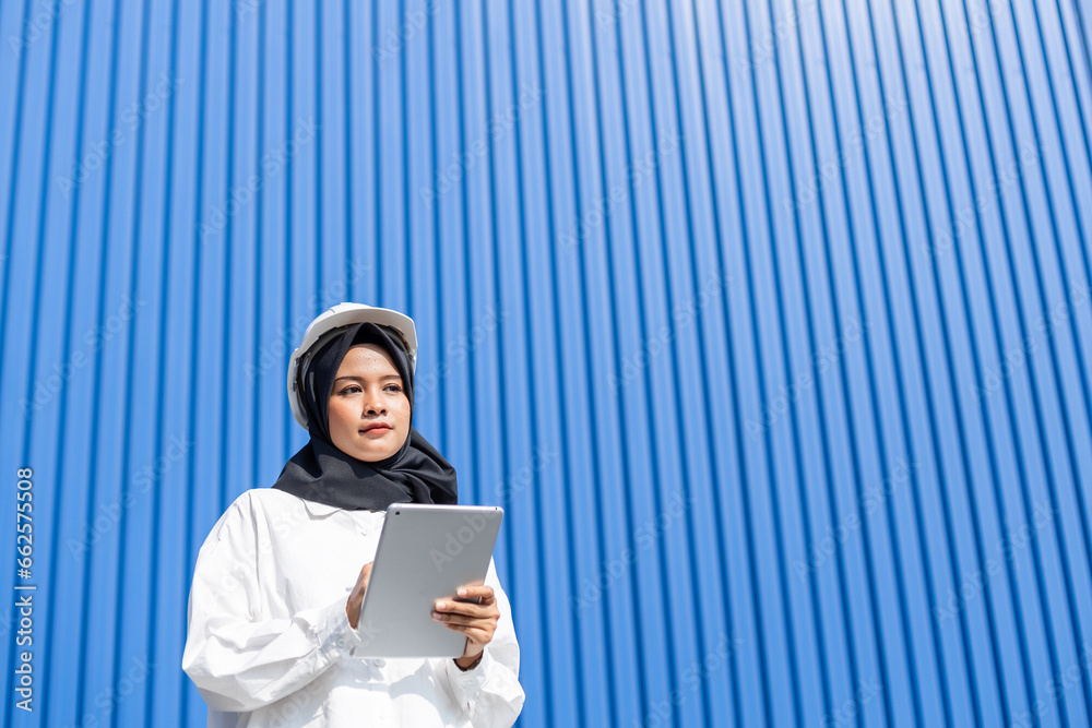 asian muslim woman industrial engineer in uniform wearing safety hard hat using tablet checking containers loading. Area logistics import export and shipping cargo freight ship.