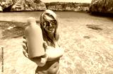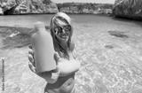 Woman showing bottle of sunscreen bottle on the beach