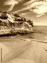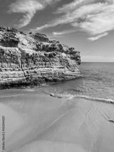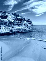 Rocky ocean coastline, sandy beach, blue sky and blue sea