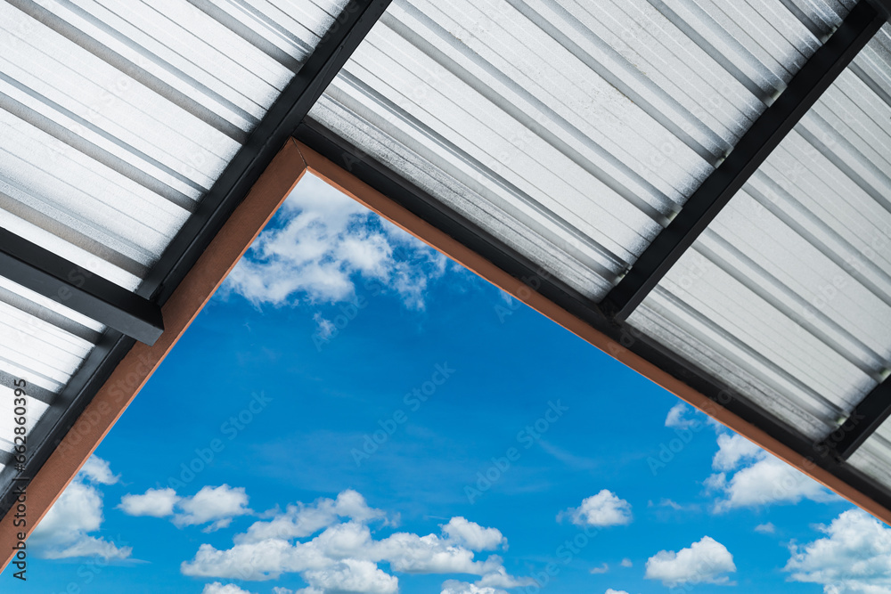Metal sheet, aluminum roof structure against blue sky on daylight well space for text