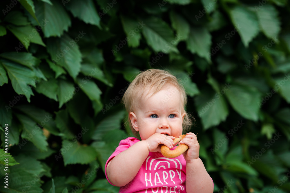 Portrait of a Caucasian blonde baby has a bagel on the background of a green bush with leaves