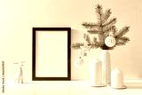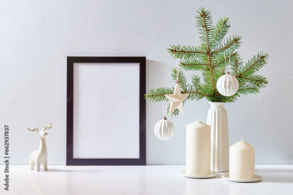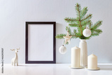Mock up black poster frame with christmas decoration in home interior, scandinavian style. Green fir branches in a vase, deer and ball on a white table