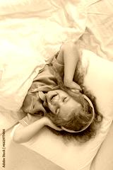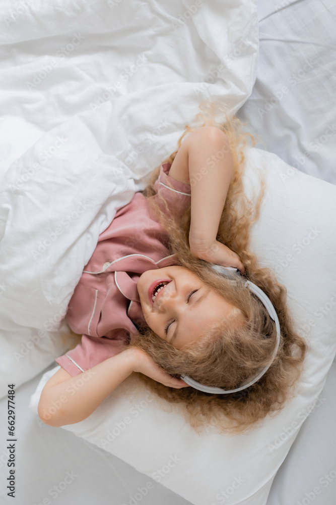 Curly-haired girl in white headphones is lying in bed covered with a blanket