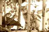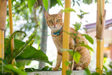Curious looking cat hiding behind bamboo tree, animal with tropical nature, pet in Asia