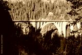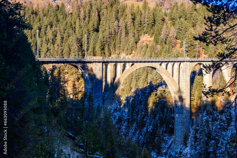 View of Wiesen Viaduct, Rhaetian railway, Graubunden in Switzerland at winter