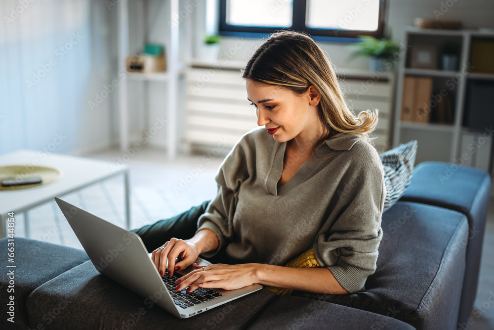 Home office. One smiling woman using laptop. Work, freelance, social media, technology concept.