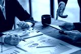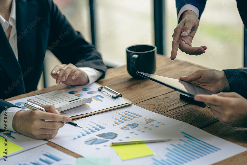 Investors, businessmen meeting to discuss stock statistics, summary graph analysis, business expense reports. and working information regarding the company's financial statements