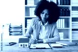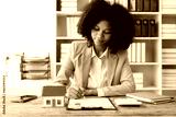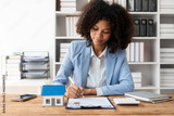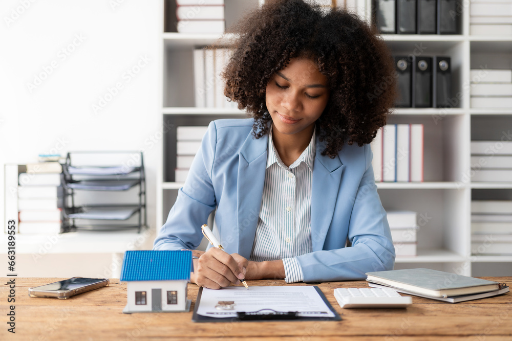 African American girl holds pen to read agreement document to sign land loan with real estate agent or bank teller, insurance concept